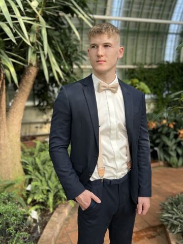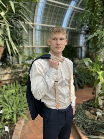 Celý outfit doplňuje set pánských šlí a motýlku tmavě smetanové barvy.