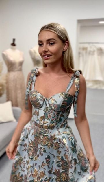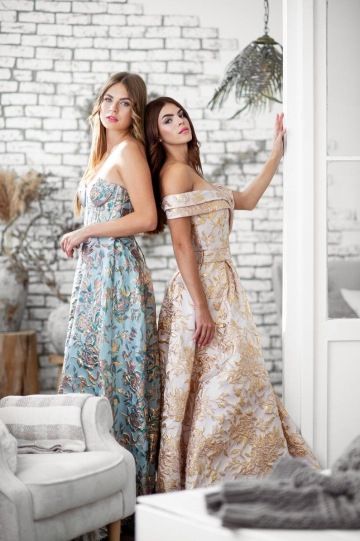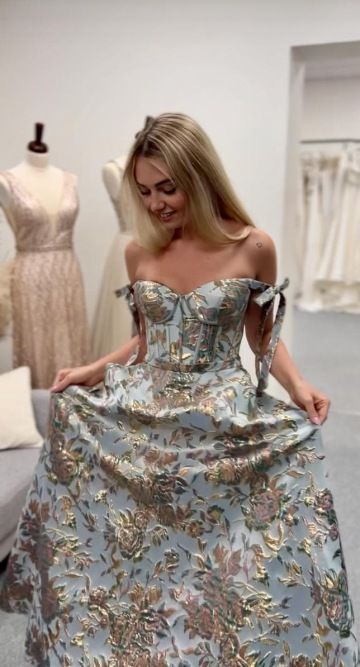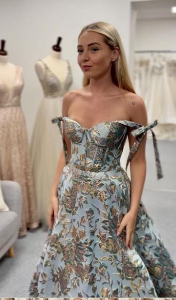 Luxusní společenské šaty ze lehkého brokátu. Šněrování, připínací jednoduchá ramínka + ramínka k uvázání na mašličku. Kostice perfektně tvarují postavu a dodávají pocit jistoty při nošení bez ramínek.