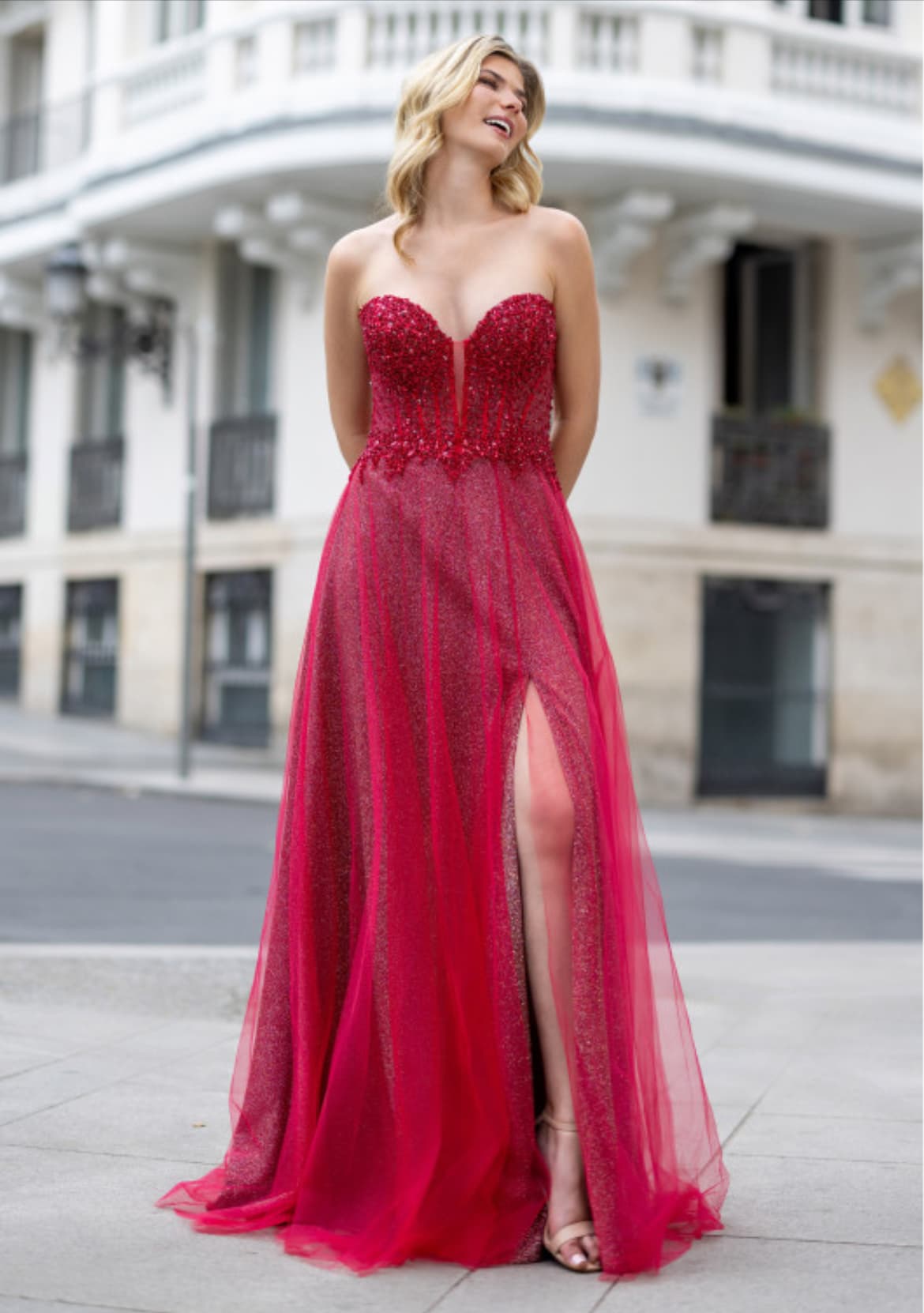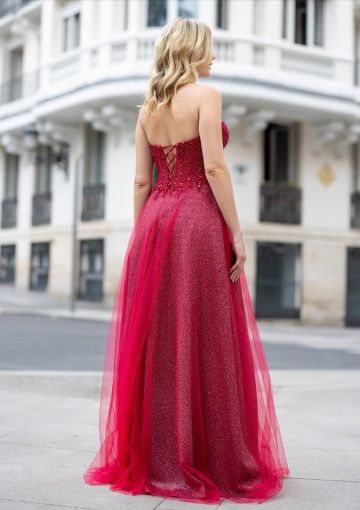 Luxusní společenské šaty se šněrováním a rozparkem. Výšivka s korálky a křišťály, korzet perfektně drží a krásně tvaruje postavu. Lze připnout špegetová ramínka.
