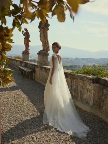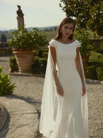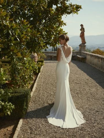 Luxusní svatební šaty z kolekce Divine prestižní značky Modeca. Materiál krásně splývá a střih zdůrazňuje postavu. Hluboký výstřih na zadním díle a rukávky ozdobené 3D květinami dodávají romatický nádech.