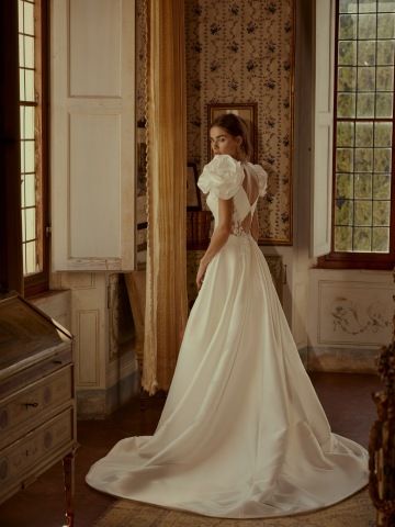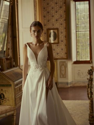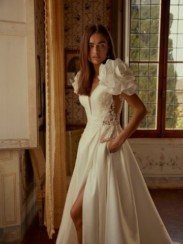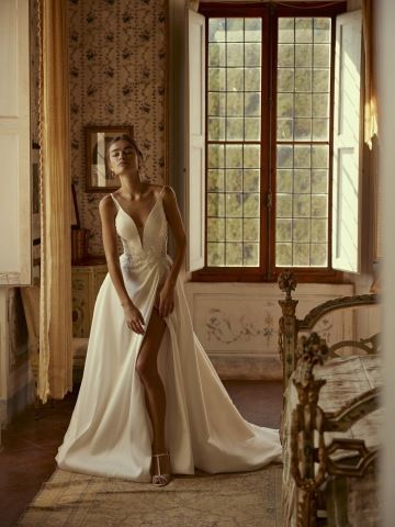 Luxusní svatební šaty z kolekce Divine by Modeca. Střih vykouzlí dokonalý dekolt. Zajímavě řešená záda, rozparek a kapsy.