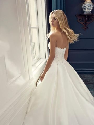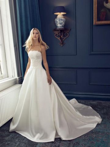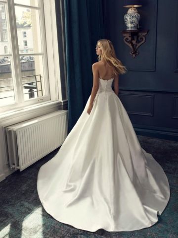 Dokonalé šaty pro moderní princeny z kolekce 2020 prestižní značky Modeca. Bohatá sukně s kapsami je díky materiálu lehoučká. Šněrování a podšívka korzetu v jemném pudrovém odstínu v kombinaci s krajkou vyšívanou drobnými flitříky dodává těmto šatům pocit něžnosti a zároveň luxusu.
