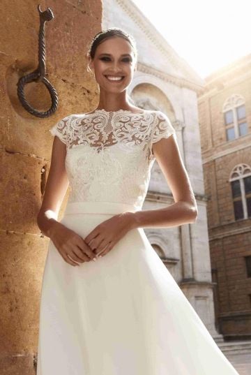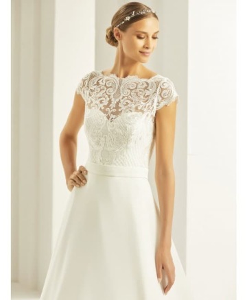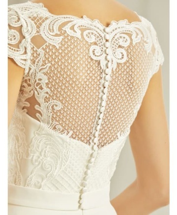 Střih a vypracování perfektně podrží i větší prsa a opticky vytvaruje pas, proto je vhodný nejen pro štíhlé, ale i pro plnoštíhlé nevěsty (dostupné ve velikosti 34-54)