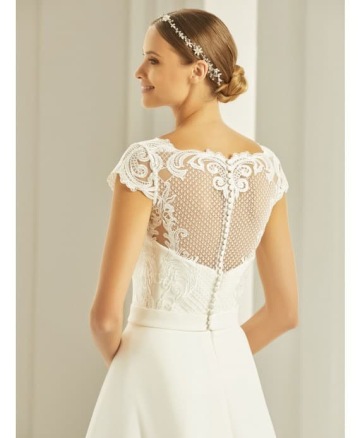 Lehoučký model z kolekce značky Bianco Evento. Nádherné hladké šatičky ve stylu BOHO CHIC ideální pro svatby v přírodě. Na prvních obrázcích doplněné o krajkové bolerko E 269. K šatům patří i jednoduchý pásek s taftovou mašličkou. Na výběr je cca 8 typů bolerek.
