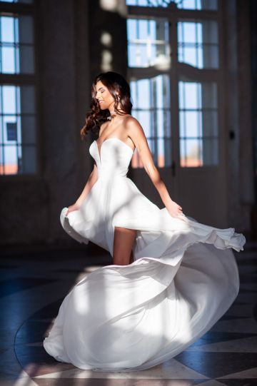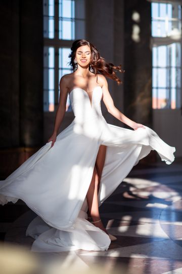 Luxusní svatební šaty z velmi oblíbené prodejní kolekce BIANCO EVENTO. Pohodlný model v minimalistickém stylu, který se skvěle kombinuje s ramínky či spadlými rukávky, nebo krajkovými bolerky. Pokaždé můžeme vytvořit originální model. Díky vnitřnímu vyztužení korzetu je vhodný i v plus size.